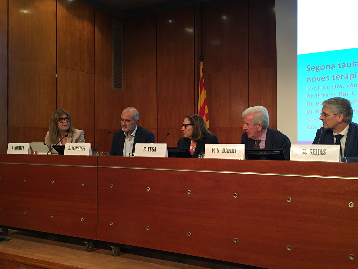 En la segunda mesa, sobre mecanismos para la incorporación y vigilancia de nuevas terapias en los centros sanitarios privados y moderada por la visecretaria del CoMB, Sònia Miravet, intervinieron Pere N. Barri, ginecólogo del Hospital Universitari Dexeus y miembro de la CD del CoMB; Bartolomé Martínez, médico y consejero delegado de Clínica Corachán; Roberto Seijas, traumatólogo del Instituto Cugat de Barcelona y miembro de la CD del CoMB; y Petra Vega, médica y codirectora del Máster de Medicina Estética y del Bienestar de la UB-IFMiL.