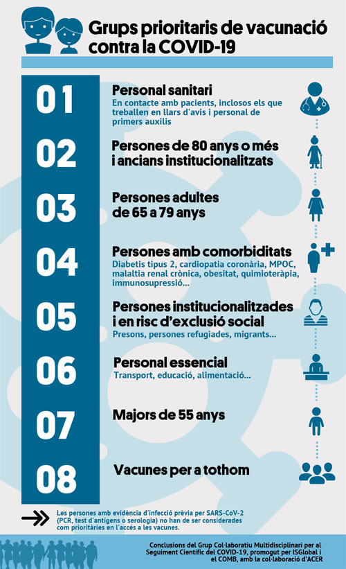 Aquest ha estat l’objectiu del Grup Col·laboratiu Multidisciplinari per al Seguiment Científic de la COVID-19 (GCMSC), una plataforma independent de científics promoguda conjuntament per l’Institut de Salut Global de Barcelona (ISGlobal), centre impulsat per la Fundació “la Caixa”, i el Col·legi de Metges de Barcelona (CoMB), amb la col·laboració de l’Associació Catalana de Centres d’Investigació (ACER), que presenta avui el seu primer informe sobre grups prioritaris per a la vacunació contra la COVID-19.