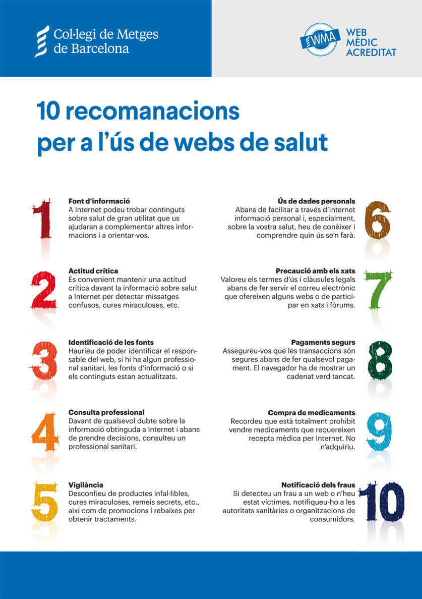 El Col·legi de Metges de Barcelona (CoMB), amb la col·laboració del programa d’acreditació de qualitat de webs de metges del CoMB, Web Mèdic Acreditat (WMA), ha publicat el decàleg “10 recomanacions per a l’ús de webs de salut”, adreçat a pacients i ciutadans en general, amb la finalitat d’ajudar-los a navegar de manera segura i responsable per webs amb contingut sanitari. El document segueix els criteris del programa WMA i els seus “Principis de bona Pràctica”, on s’hi inclouen els aspectes que es tenen en compte perquè una pàgina web de salut aconsegueixi l’acreditació de qualitat de WMA, un segell que assegura que es tracta d’un web de confiança.