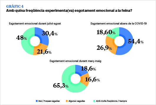 Pel que fa als metges i metgesses que van treballar a UCI i serveis d’urgències, fins el 68 % van declarar, per exemple, que en el moment més àlgid de la pandèmia (març-abril) se sentien cansats sempre o molt sovint (per sobre del 57,6 % de la mostra total), un percentatge que abans de la crisi era del 27,7 % (18,9 % a la mostra total) i que encara es mantenia en el 47,4 % al juliol-agost (42 % a la mostra total).