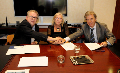 D'esquerra a dreta: Dr. Jaume Padrós, president del CoMB; Núria Carrera, degana del TSCAT, i Dr. Miquel Vilardell, president de la Fundació Galatea