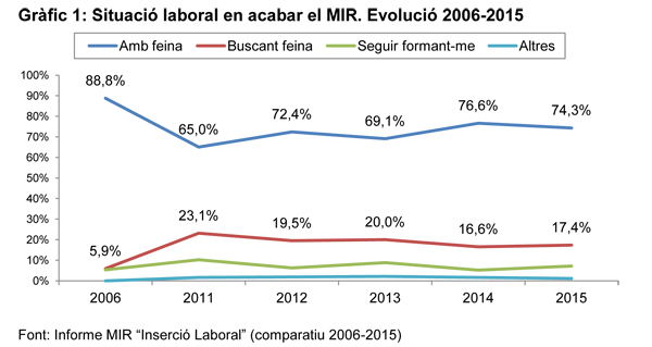Malgrat que l’atur no és el principal problema del col·lectiu mèdic (només afecta l’1,2% dels col·legiats), els anys de crisi sí que han fet minvar el grau d’inserció laboral dels més joves, ja que actualment tenen feina el 74,3%, mentre que l’any 2006 treballaven el 88,8% (Taula 1 i Gràfic 1).