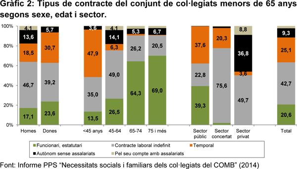 Entre les principals conclusions del treball, destaca la manca d’estabilitat laboral, ja que entre el conjunt de col·legiats (menors de 65 anys), només el 63,3% té un contracte indefinit, un percentatge que es redueix al 48,5% entre els de menys de 45 anys i al 13% en el cas dels metges joves en acabar el MIR (Gràfics 2 i 3).