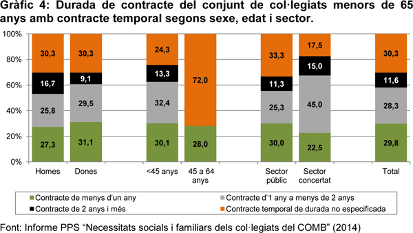 El 30% dels contractes temporals tenen menys d’un any de durada. (Gràfic 4). Però la situació és especialment alarmant entre els metges més joves, amb un 67% dels contractes temporals inferiors a un any i un increment dels contractes per hores (9,6%) i per dies (5,1%), modalitats pràcticament inexistents abans de la crisi