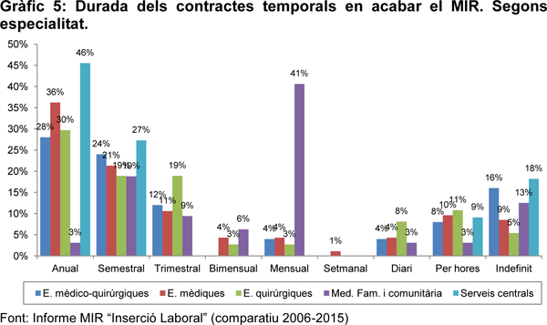 La temporalitat afecta especialment els joves metges de família. El 97% dels contractes temporals en aquest segment són de menys d’un any de durada. Fins el 40,6% són contractes mensuals, la modalitat més habitual (Gràfic 5).