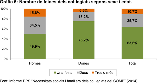 Gairebé el 26% dels metges actius tenen dues feines i prop de l’11% en tenen tres o més. La pluriocupació afecta el 50,1% dels metges homes. (Gràfic 6)