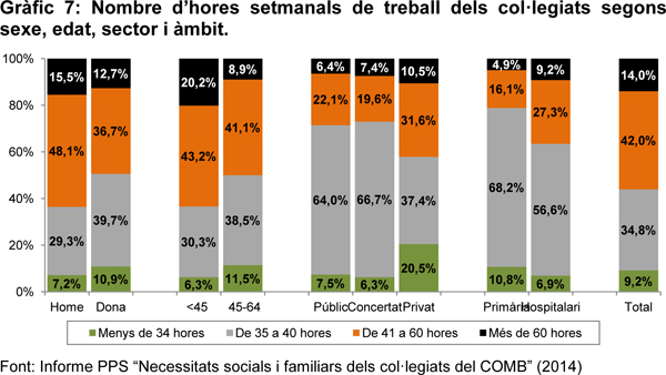Pel que fa a les hores de treball, el 56% dels col·legiats treballa més de 40 hores setmanals i el 14%, més de 60. (Gràfic 7)