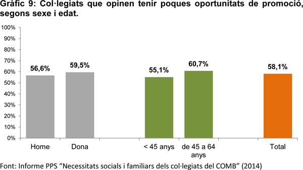 El 31,2% dels metges actius manifesten tenir una situació laboral insegura. Aquesta percepció s’enfila fins el 68% en el grup de 30 a 34 anys i no baixa del 20% en cap franja d’edat per sota dels 60 anys. (Gràfic 8). A més el 58,1% dels col·legiats creuen que tenen poques possibilitats de promoció. (Gràfic 9)
