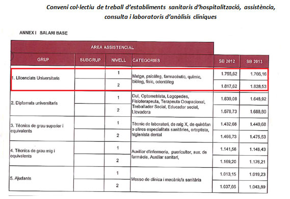 • Conveni col·lectiu de treball d’establiments sanitaris d’hospitalització, assistència, consulta i laboratoris d’anàlisis clíniques: 25.000 euros bruts anuals per jornada completa