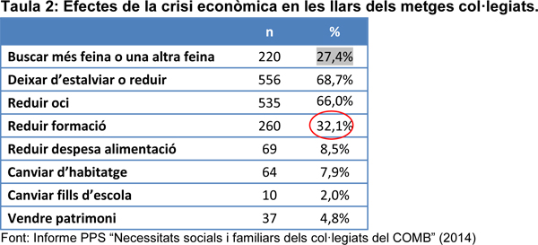 Pel que fa a l’impacte directe de la crisi a les llars dels metges col·legiats, el 27,4% han hagut de buscar una altra feina per completar els ingressos i el 32% han reduït despesa en formació, a banda d’altres afectacions. (Taula 2)