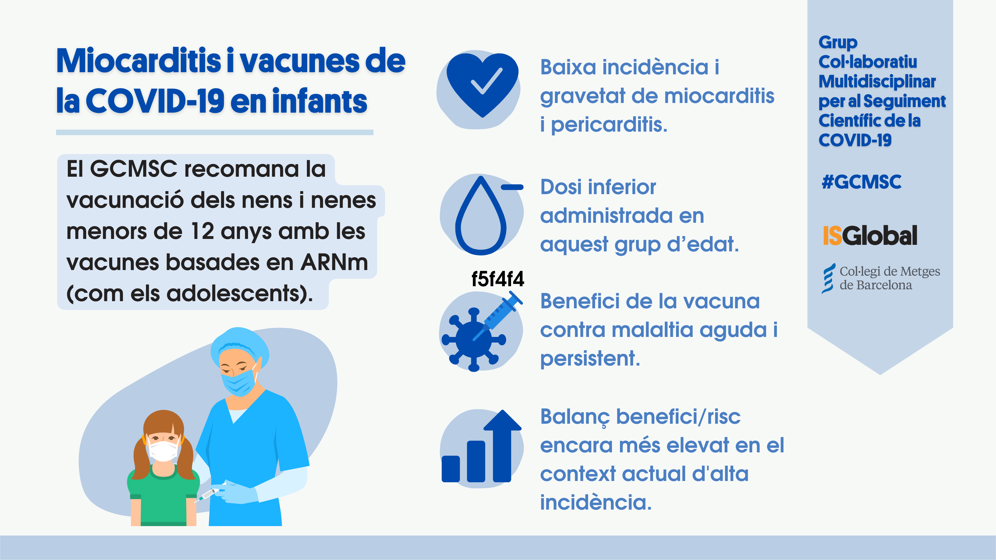 La vacunació de la població pediàtrica amb vacunes de la COVID-19 basades en ARNm és segura i recomanable. Així ho indica el Grup Col·laboratiu Multidisciplinari per al Seguiment Científic de la COVID-19 (GCMSC), impulsat per l'Institut de Salut Global de Barcelona (ISGlobal) i el Col·legi de Metges de Barcelona (COMB), al seu darrer document d'anàlisi titulat Risc de miocarditis i pericarditis en la infància i l'adolescència en el context de la vacunació de la COVID-19 amb vacunes ARNm.