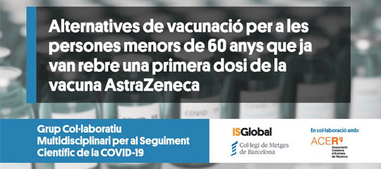 Davant la necessitat d’oferir una resposta a aquests milers de persones que esperen completar la seva immunització, el Grup Col·laboratiu Multidisciplinari per al Seguiment de la COVID-19 (GCMSC), impulsat pel Col·legi de Metges de Barcelona (CoMB) i ISGlobal Barcelona, acaba d’emetre un comunicat en el qual recomana que es completi la vacunació d’aquestes persones amb una segona dosi de la vacuna AZ. Els experts que formen part d’aquest grup han revisat les evidències disponibles sobre els riscos i beneficis que implicaria administrar una segona dosi d’AZ a aquestes persones, versus els riscos que suposaria administrar un altre tipus de vacuna (ARNm) o bé no administrar-ne cap més i han conclòs: