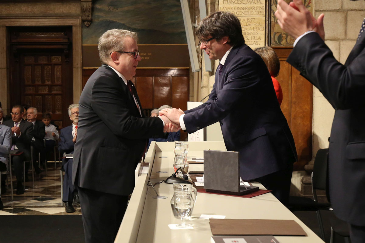 El president del Col·legi, Jaume Padrós, va rebre ahir la Creu de Sant Jordi, un dels màxims reconeixements que atorga la Generalitat de Catalunya. L’acte de lliurament va tenir lloc al Palau de la Generalitat. En total van ser guardonades 29 persones i 24 entitats, que van rebre la Creu de mans del president de la Generalitat, Carles Puigdemont.