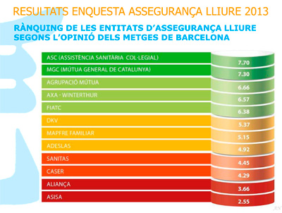 El Col·legi de Metges de Barcelona ha donat a conèixer els resultats de l'enquesta d'assegurança lliure 2013 i ha presentat un rànquing de les mútues en funció de l’opinió dels metges que treballen en aquest sector. El Dr. Jaume Padrós, vicepresident 1er del COMB, i el Dr. Ramon Torné, President de la Secció Col·legial d'Assegurança Lliure, han informat sobre la situació de la medicina privada a Catalunya. Veure la roda de premsa