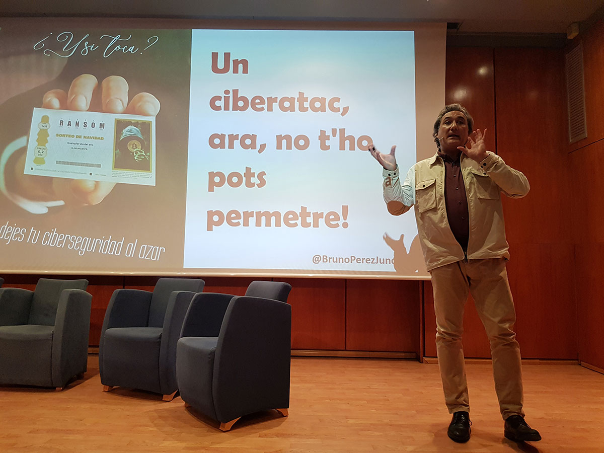La jornada va començar amb la conferència ‘Ciberseguretat, un bany de realitat’, a càrrec de Bruno Pérez Juncà, pèrit judicial i informàtic forense i expert en ciberseguretat i privacitat. Aquest expert va posar sobre la taula els perills reals i quotidians als quals tothom està exposat en el seu dia a dia en aquest àmbit. Pérez va posar l’accent en la importància de tenir implementades mesures de seguretat, ja que “els ciberdelinqüents busquen aquell qui no les pren”. Va recomanar tenir totes les actualitzacions de les aplicacions i dispositius al dia i formar-se sobre com funciona la tecnologia que utilitzem i sobre com fer-ne una gestió responsable, tenint cura, per exemple, de les diferents opcions a l’hora de configurar els dispositius.