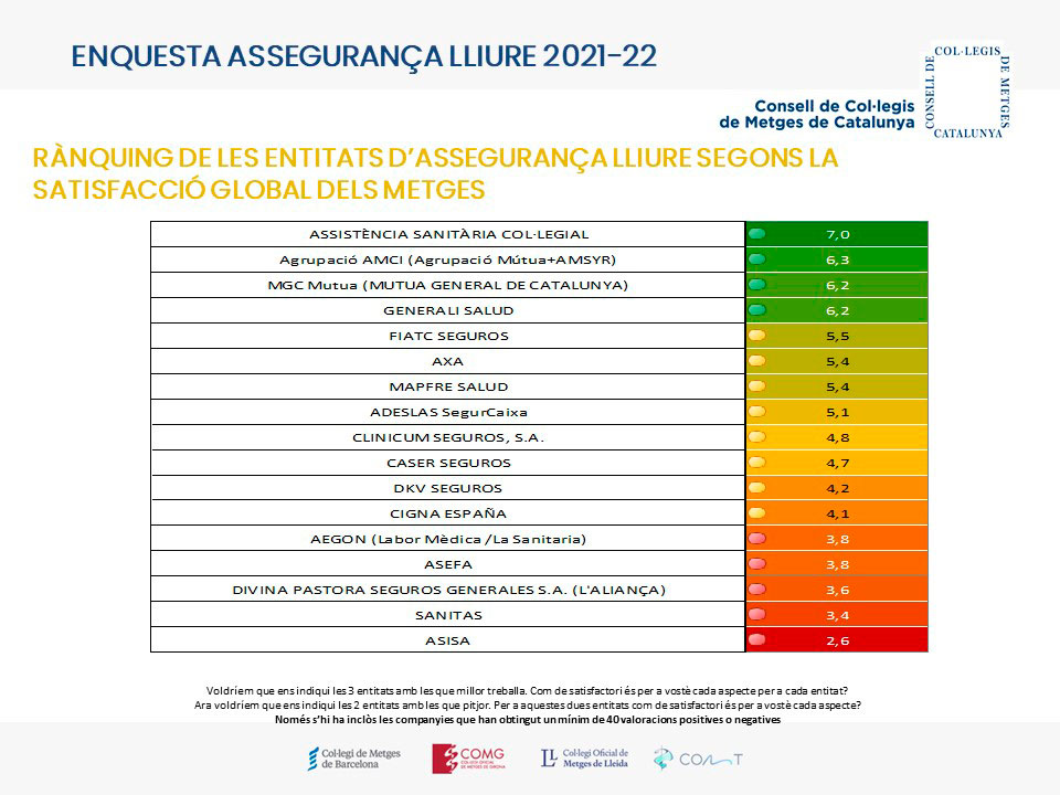 Rànquing de les entitats d'assegurança lliure segons la satisfacció global dels metges
