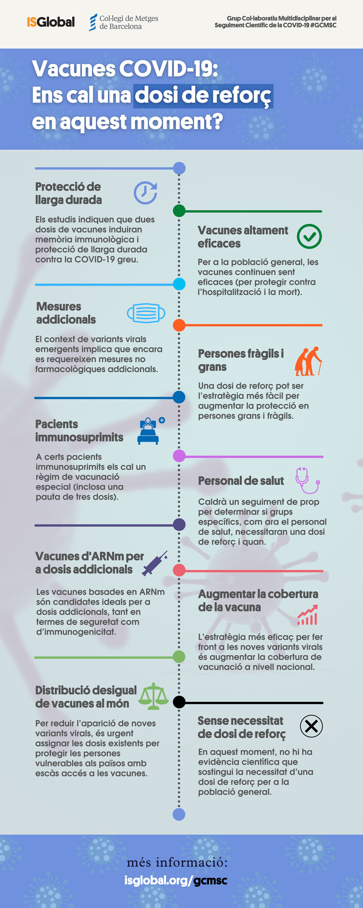 Després de revisar l’evidència científica disponible, el Grup Col·laboratiu Multidisciplinari per al Seguiment Científic de la COVID-19 (GCMSC) conclou que ara per ara no hi ha evidència que a la població general li calgui una dosi de reforç