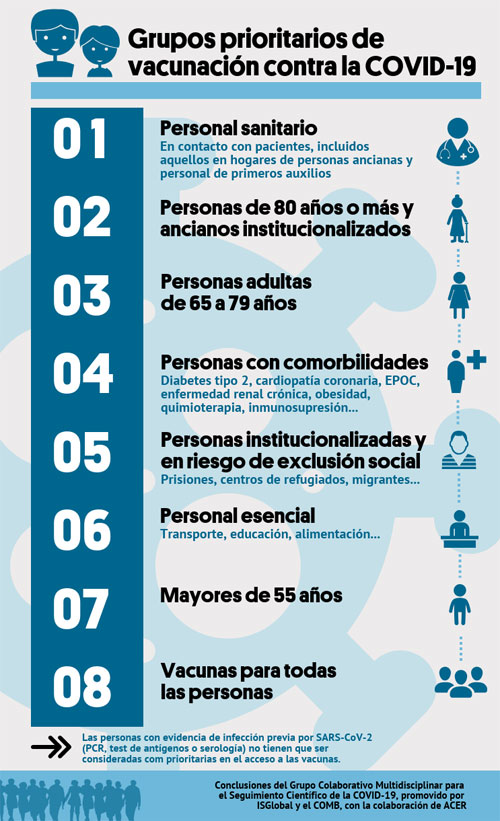 El grupo de expertos señala que las personas con evidencia de infección por SARS-CoV-2 (ya sea por PCR, por test de antígeno o por anticuerpos frente al virus) podrían considerarse como no prioritarias para la vacunación, como mínimo en las primeras fases. Además, también señala que estas prioridades podrán ajustarse según las características de las diferentes vacunas disponibles.