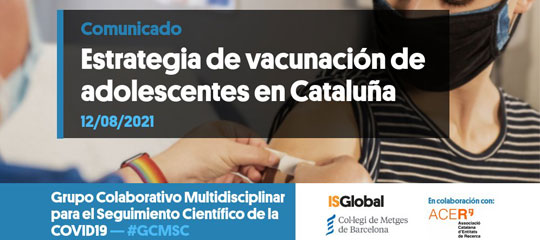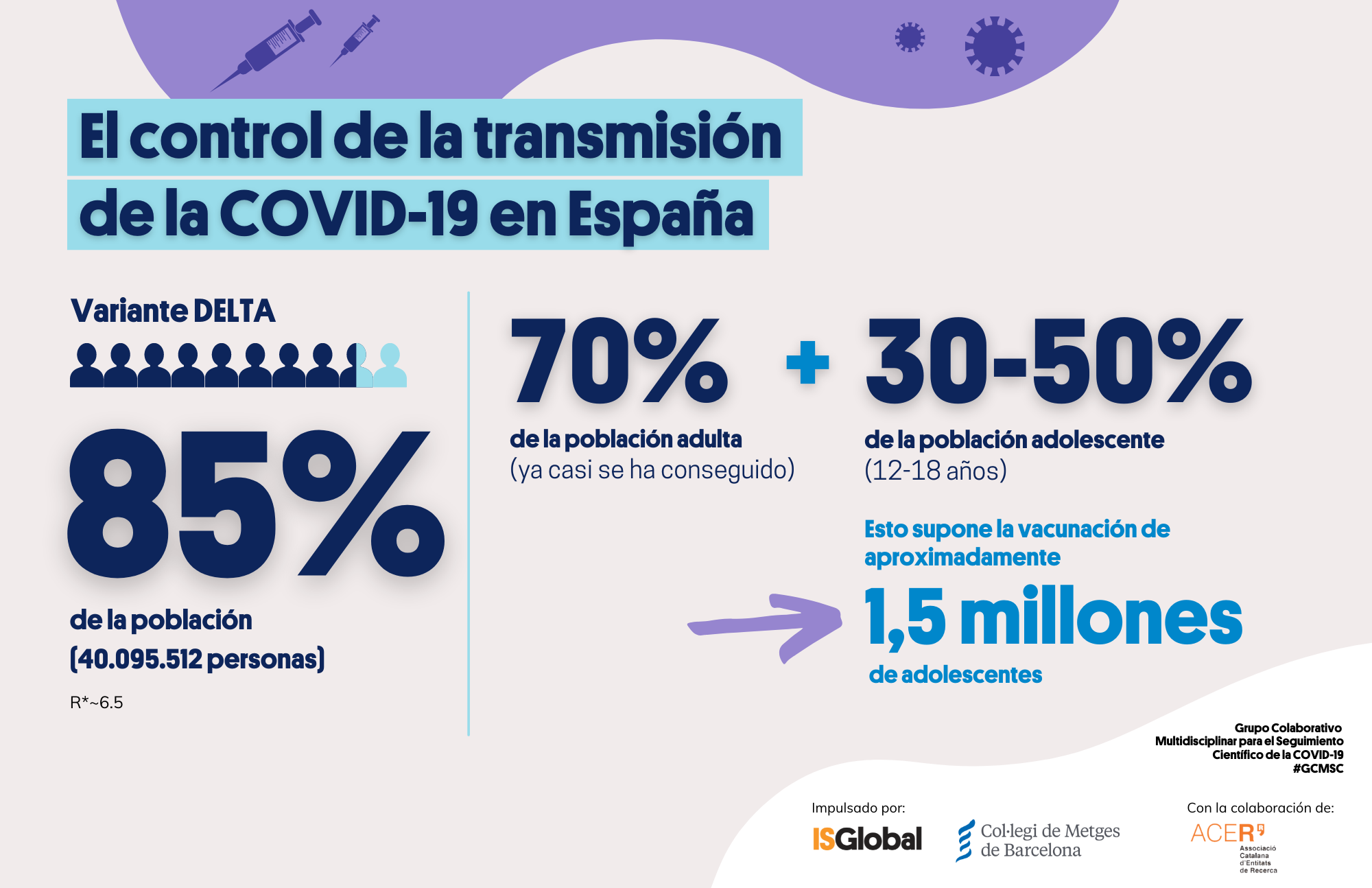 El Grupo Colaborativo Multidisciplinar para el Seguimiento Científico de la COVID-19 (GCMSC) ha emitido un comunicado en el que concluye que, dadas las circunstancias epidemiológicas en España, es necesario vacunar a la población entre 12 y 17 años de edad para alcanzar el control epidemiológico de la pandemia. Tras realizar diversas simulaciones por medio de modelos matemáticos, este grupo científico recomienda proceder a la inmunización de esta franja de edad "lo antes posible" y aprovechar para ello la plataforma que ofrecen los centros escolares.