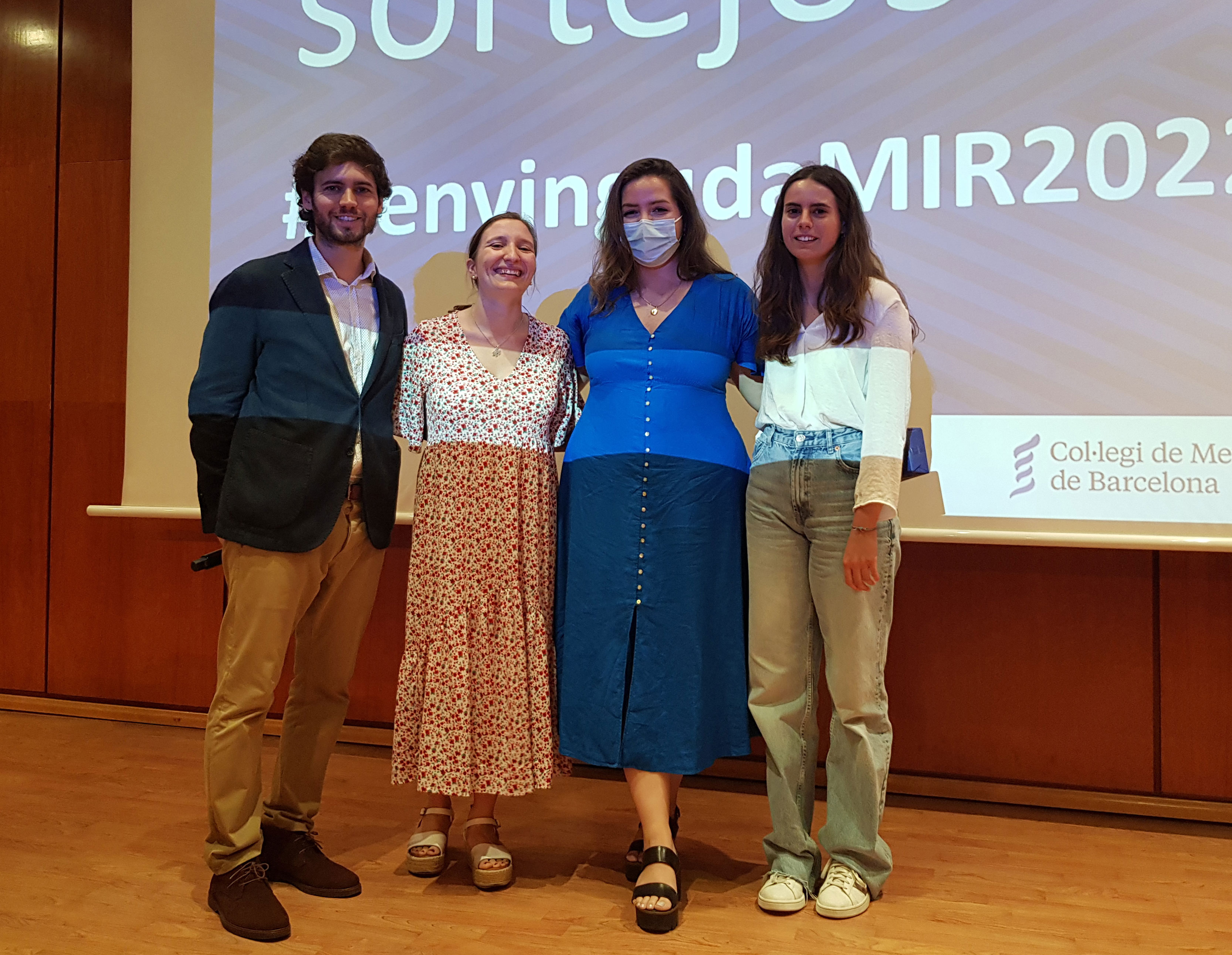 Las ganadoras de los dos sorteos, Júlia Sanchez y Maria Piñol, con los miembros de la sección de Médicos MIR y Médicos Jóvenes
