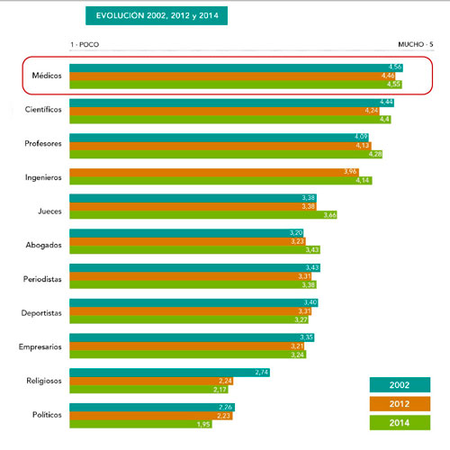 Según datos de la VII Encuesta de Percepción Social de la Ciencia, los médicos son los profesionales mejor valorados y reconocidos por la sociedad. Con una puntuación de 4,55 sobre 5, los profesionales de la salud continúan liderando este ranking, seguidos de los científicos (4,4), los profesores (4,28) y los ingenieros (4,14).