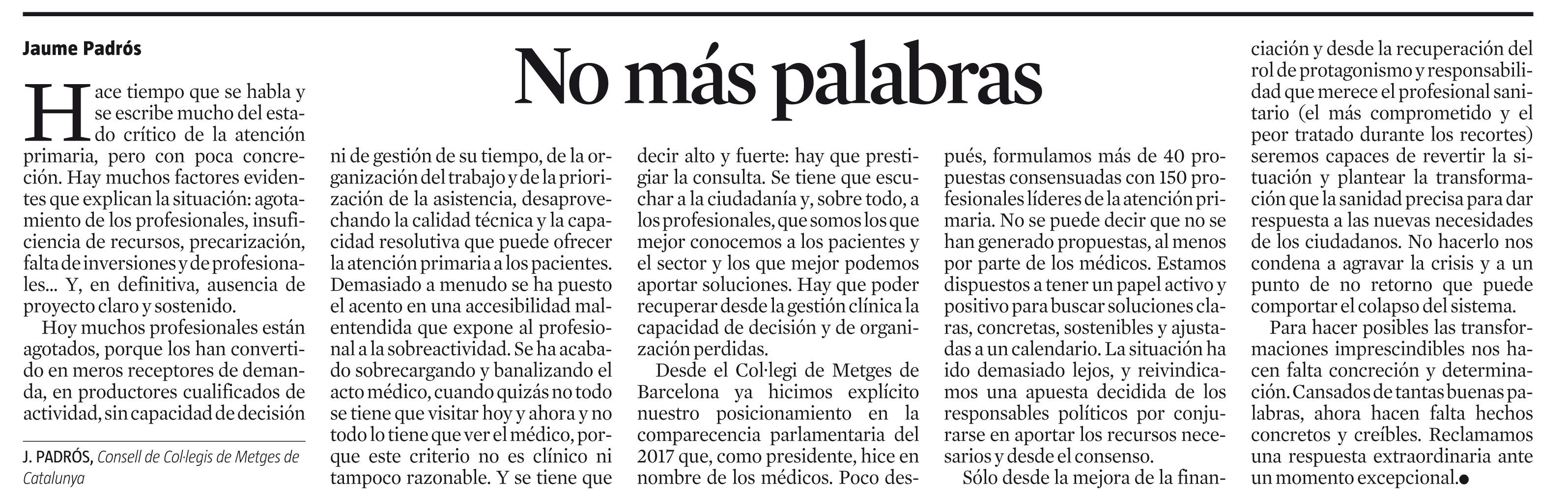 El domingo, 11 de noviembre, el presidente del Colegio de Médicos de Barcelona (CoMB), Jaume Padrós, publicó un a artículo en La Vanguardia donde expresa la opinión del Consejo del Colegios de Médicos (CCMC) en relación "al estado crítico de la atención primaria" que ha llevado hasta la convocatoria de una huelga inminente.
