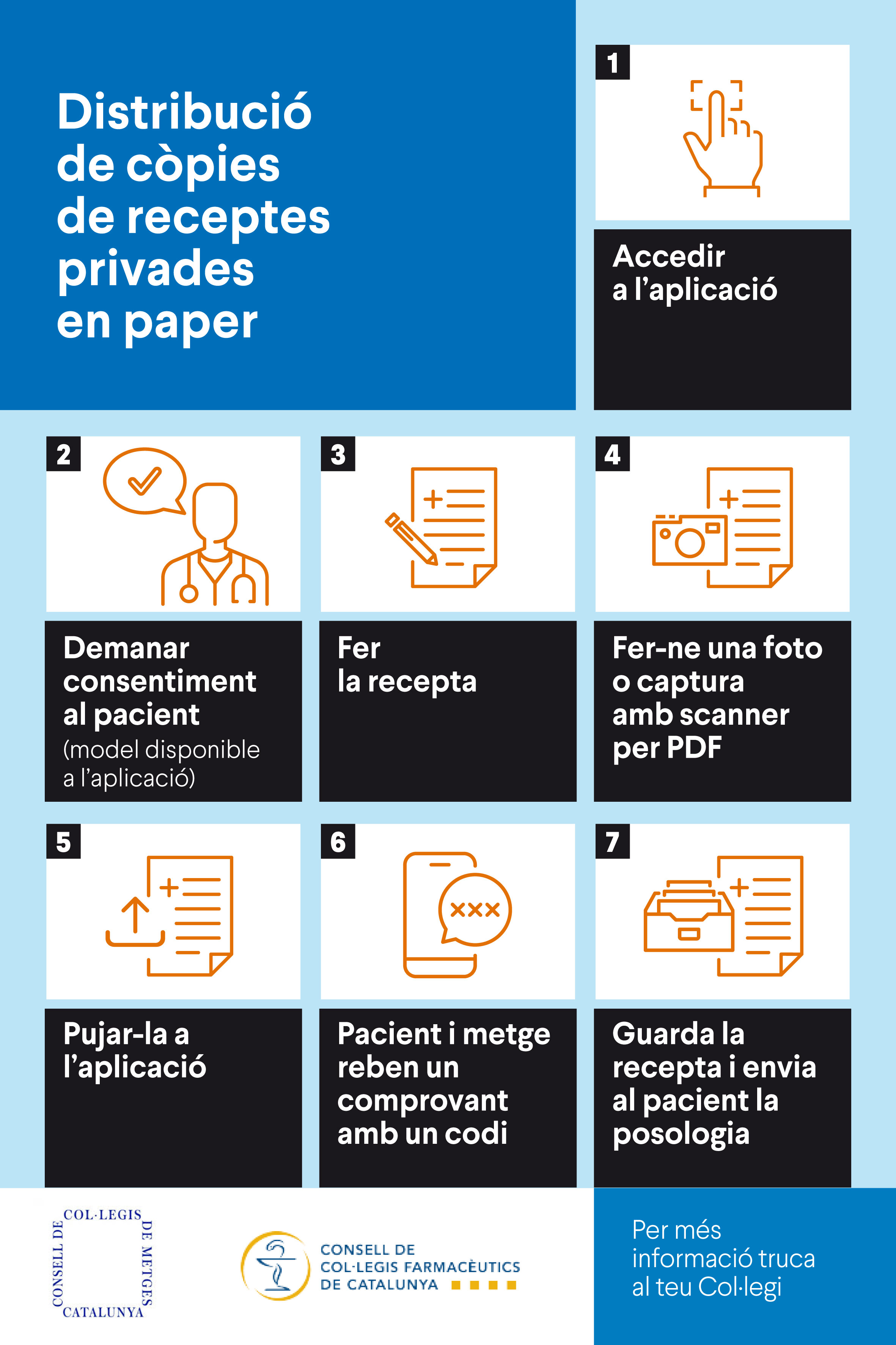 Para hacer frente a esta dificultad de comunicación, el Consejo de Colegios de Médicos de Cataluña (CCMC), junto con el Consejo de Colegios de Farmacéuticos de Catalulña (CCFC), han desarrollado y puesto en marcha de manera excepcional mientras se mantengan las limitaciones a a libre circulación, una plataforma informática para que electrónicamentevia se puedan compartir con las oficina de farmacia copias de recetas privadas en papel de forma segura, con garantía de la integridad y de la dispensación única por cada receta.