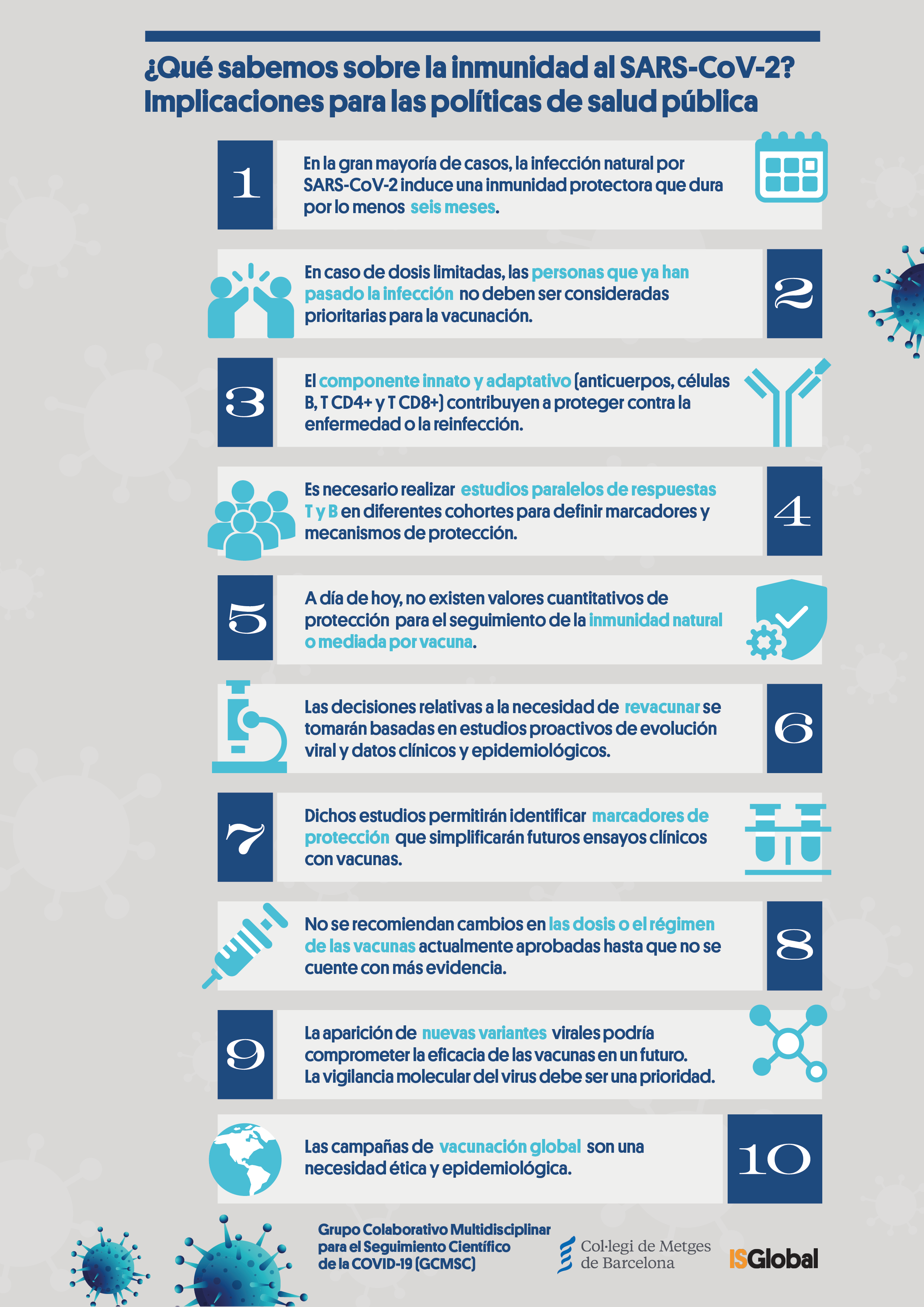 El documento acaba con una serie de conclusiones basadas en la evidencia actual. La primera y más importante es que la gran mayoría de las personas genera una inmunidad protectora que dura por lo menos seis meses, y probablemente más. “Por esta razón insistimos que, en un contexto de dosis limitadas, las personas que ya han pasado la infección no sean consideradas como prioritarias para la inmunización,” señala Silvia de Sanjosé, presidenta del GCMSC y autora principal del primer documento del grupo sobre grupos prioritarios para la vacunación.