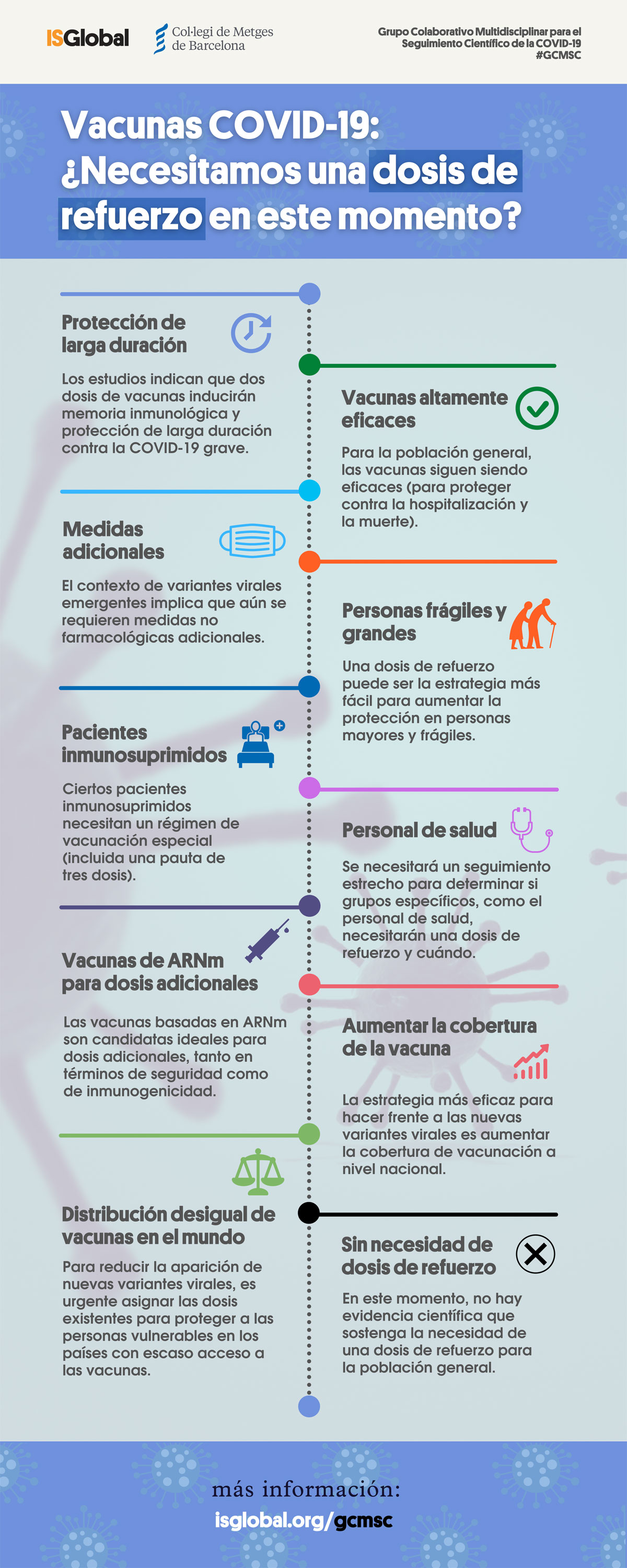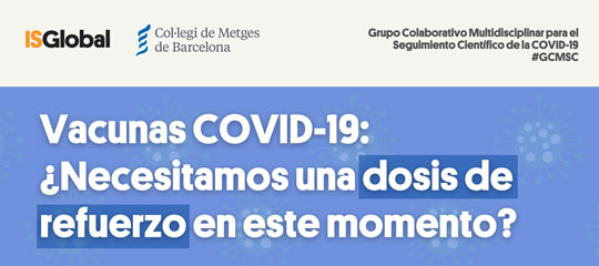A raíz de la ola de casos ocasionada por la variante delta del SARS-CoV-2, diferentes países de renta alta se han planteado la posibilidad de ofrecer dosis de refuerzo a la población ya vacunada con pauta completa. Tras un análisis de la evidencia científica disponible a día de hoy, el Grupo Colaborativo Multidisciplinar para el Seguimiento Científico de la COVID-19 (GCMSC), ha concluido que, en la población general, no hay evidencia de que se necesite una dosis de refuerzo en este momento.