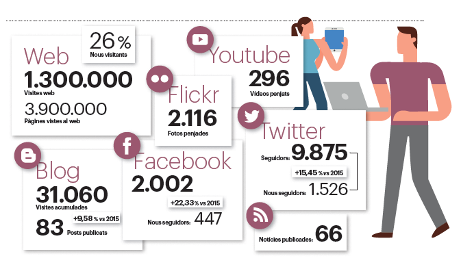 Pel que fa al blog del Col·legi, la tendència continua sent positiva. Al llarg de l'any s'han publicat 83 articles de temàtiques diverses i la mitjana de visites diàries se situa en les 85. El total de visites acumulades supera les 31.000, el que representa un increment del 9,5 % respecte a l'any anterior. Si ens fixem en les xarxes socials, la tendència també ha estat positiva. En el cas de Twitter el nombre de nous seguidors ha estat de 1.526, fins arribar a un total de 9.875. A Facebook, s'han aconseguit 447 nous "m'agrada", que sumats als de l'any anterior han superat els 2.000. Pel que fa a Youtube, s'han penjat 296 vídeos que recullen totes les jornades i esdeveniments que s'han realitzat des de la institució.