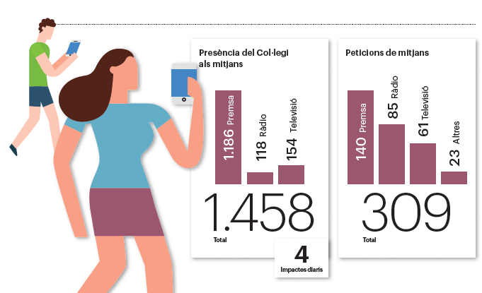 Els mitjans de comunicació també s'han interessat aquest any per programes, serveis i activitats del Col·legi, com ara l'enquesta bianual sobre els metges i les entitats d'assegurança lliure, els Premis a l'Excel·lència, el Programa d'Atenció Integral al Metge Malalt (PAIMM), etc. Cal destacar també el ressò creixent que els actes comarcals del CoMB han tingut als mitjans de comunicació locals. Al marge de les informacions generades directament pel CoMB (rodes de premsa, notes, etc.), el departament de Premsa i Mitjans Externs del Col·legi ha gestionat 309 peticions de periodistes de diferents mitjans de comunicació, una dada que demostra que el Col·legi és una font de referència en l'àmbit de la informació sanitària.