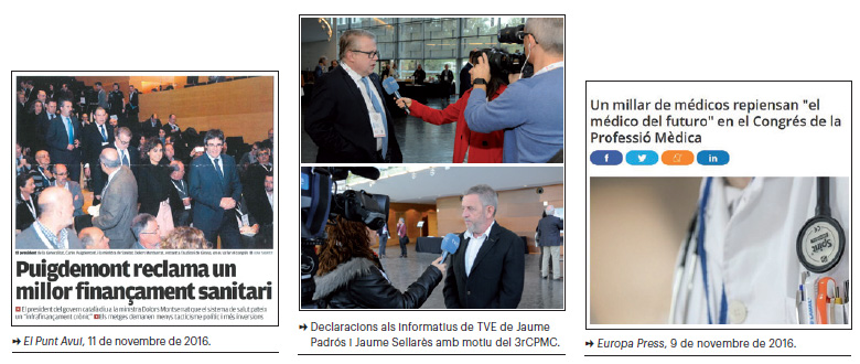 El 3r Congrés de la Professió Mèdica de Catalunya (CPMC) i l'aprovació de la Declaració de Girona, han estat alguns dels temes més reflectits als mitjans de comunicació. Al novembre a La Vanguardia, Jaume Padrós, president del Col·legi de Metges de Barcelona (CoMB), demanava "un gran consens polític i social" per aconseguir una sanitat "sostenible i viable" i sense instrumentacions partidistes. El Punt Avui recollia les paraules de Padrós en aquest mateix sentit. A Europa Press, el president del Col·legi assegurava que el sistema sanitari "necessita canvis i recursos". Per la seva banda, Jaume Sellarès, coordinador general del 3r CPMC, declarava a Gaceta Médica que "és important fer ara el Congrés perquè hem patit un període de crisi que ha canviat la societat. La mateixa sociologia dels metges també està canviant; tenim situacions que no eren tan evidents, com el perfil del pacient".