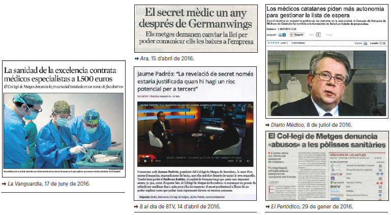 El Col·legi de Metges va denunciar en una roda de premsa celebrada al gener de 2016 "tres amenaces importants" en el sector de les companyies d'assegurances sanitàries que "posen en perill la qualitat assistencial". Van informar sobre aquesta roda de premsa les agències EFE, Europa Press i ACN, els diaris La Vanguardia, El Periódico, Ara, El Punt Avui i Expansión, i les publicacions electròniques Diario Médico i Vilaweb.
