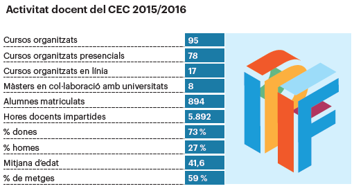 El curs passat es van organitzar 95 cursos, 78 de presencials i 17 a distància en línia, amb 894 alumnes. El conjunt d'hores docents impartides ha estat de 5.892.