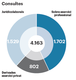 S'han atès més de 4.000 col·legiats en consultes repartides en proporcions similars entre consultes pròpies de l'exercici professional (deontologia, documentació clínica, informació i consentiment, titulacions...), jurídico- laborals (contractació, guàrdies i, principalment, jubilació i cotitzacions) o derivades de l'exercici privat de la professió (inici de l'activitat, autorització de centres, societats professionals, protecció de dades...).