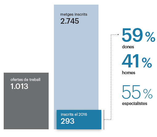L'any 2016 ha estat un any rècord en gestió d'ofertes de treball: 1.013 ofertes, un 16 % més que el 2015. Enguany s'han inscrit al Servei d'Ocupació 293 metges (5 % més que el 2015), s'hi han inscrit més dones (59 %), més especialistes (55 %) i més nascuts a l'estranger (55 %). Al final de 2016, estaven inscrits al Servei d'Ocupació 2.745 metges.