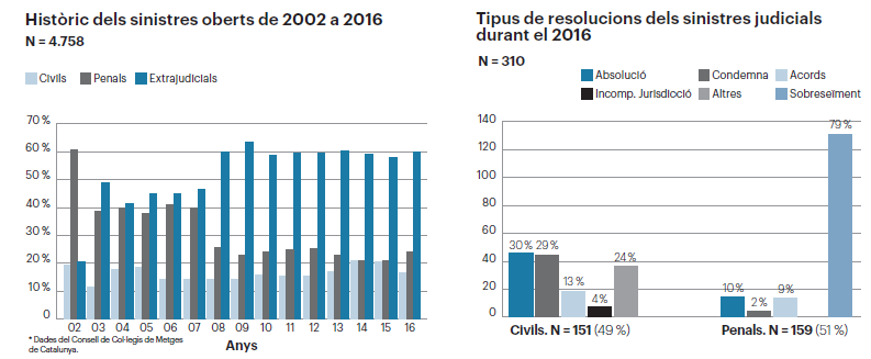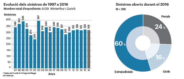 Durant l'any 2016, el nombre de reclamacions presentades ha disminuït un 3 %. Les reclamacions extrajudicials, amb un 60 %, continuen sent el tipus més freqüent de reclamació durant l'any 2016. D'aquestes, només un 20 % s'acaben transformant en una reclamació judicial. Es manté així la tendència iniciada l'any 2008 de disminució dels litigis judicials, sobretot de les denúncies penals, el que és positiu per als facultatius en la mesura que només una condemna en l'àmbit penal pot comportar la inhabilitació professional. Aquest escenari és, un any més, fruit dels esforços fets des de l'SRP per potenciar la gestió extrajudicial. El nostre objectiu és treballar perquè els pacients, els seus familiars i els seus advocats confiïn en el nostre criteri a l'hora de resoldre les seves reclamacions i allunyar els facultatius dels jutjats. Continua essent molt baix, i especialment reduït en els procediments judicials, el percentatge de procediments en què s'estableix que ha existit responsabilitat per part del metge. Durant l'any 2016, el 89 % dels assumptes penals s'han resolt amb arxiu o sentència absolutòria i les condemnes en l'àmbit civil únicament representen un 29 %.