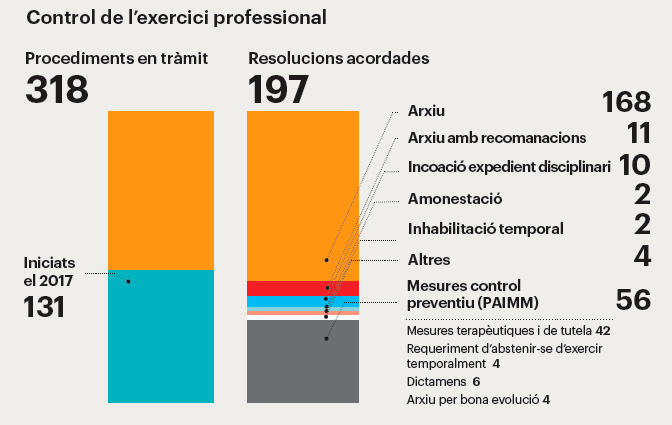 Durant el 2017, la Junta de Govern ha tramitat 318 expedients, 131 dels quals s'han iniciat al llarg de l'any. S'han adoptat 197 resolucions, 168 de les quals han suposat l'arxiu de l'expedient perquè no quedava acreditada la comissió de cap infracció. En 11 casos s'ha resolt amb l'arxiu, si bé s'ha considerat oportuna la possibilitat d'adreçar recomanacions al professional en relació amb qüestions millorables. Així també, s'han tramitat 19 expedients disciplinaris, 10 dels quals s'han incoat durant l'any. D'aquests, 4 es troben en suspensió, atesa l'existència d'un procés judicial pels mateixos fets. Se n'han resolt 9, que han comportat 2 sancions d'amonestació i 2 inhabilitacions professionals per a l'exercici. Una d'aquestes durant el termini d'un any, amb la prohibició afegida d'exercir l'especialitat d'anestesiologia i de fer activitats mèdiques en les quals els sedants, opioides o estupefaents formin part de l'arsenal terapèutic, revisable en cinc anys. L'altra inhabilitació, durant el termini d'un mes, ha comportat, a més, la sanció complementària de fer un curs de formació professional acreditat, que comprengui formació en atenció mèdica d'urgències.