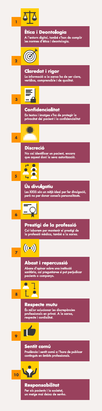 És per aquesta darrera reflexió que a la nostra Secció vam col·laborar, conjuntament amb la Comissió Deontològica i l'assessoria jurídica, en l'elaboració del document del Consell de Col·legis de Metges de Catalunya Recomanacions sobre l'ús d'informació mèdica i l'exercici de llibertat d'expressió a les xarxes socials, un document per traslladar als professionals recomanacions que els orientin en l'ús de la informació mèdica i de l'exercici de la llibertat d'expressió a les xarxes socials. S'inclou un decàleg amb les recomanacions bàsiques per a l'ús de les xarxes socials adreçat als professionals.
