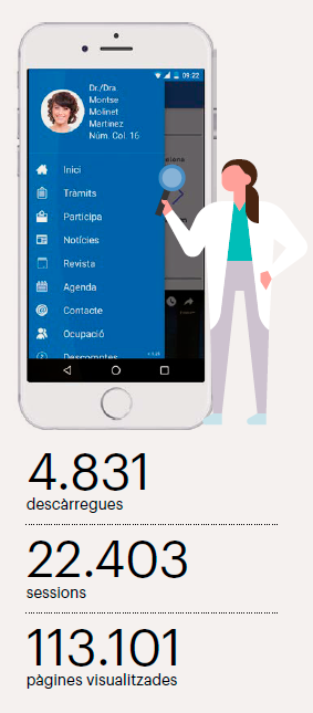 En total, 4.831 usuaris han descarregat el 2017 l'app al seu dispositiu mòbil (des de les aplicacions al Google Play per a dispositius Android i a l'App Store per al sistema IOS). Un total de 4.216 (87 %) n'han fet ús amb 22.403 sessions (consultes) i 113.101 pàgines visualitzades. MetgesBarcelona s'emmarca dins del compromís de l'entitat d'oferir als seus col·legiats eines d'utilitat per al desenvolupament de la seva professió.
