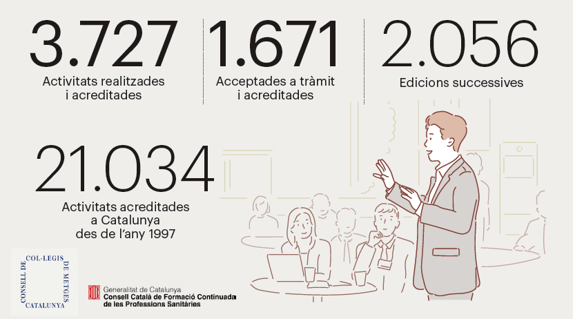 Durant l'any 2017, s'han rebut 2.008 sol·licituds d'acreditació d'activitats de formació continuada. D'aquestes, se n'han acceptat a tràmit i acreditat 1.671. El total d'activitats realitzades i acreditades ha estat de 3.727, de les quals 2.056 han estat edicions successives, és a dir, repeticions d'activitats anteriors.