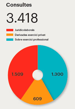 L'assessorament als col·legiats que es presta des de l'Assessoria Jurídica s'ha estabilitzat al llarg de l'any 2017 pel que fa als motius de consulta. S'han atès més de 3.400 col·legiats en consultes pròpies de l'exercici professional (deontologia, documentació clínica, informació i consentiment, titulacions), juridicolaborals (contractació, guàrdies, jubilació, cotitzacions) o derivades de l'exercici privat de la professió (inici de l'activitat, autorització de centres, societats professionals, protecció de dades).