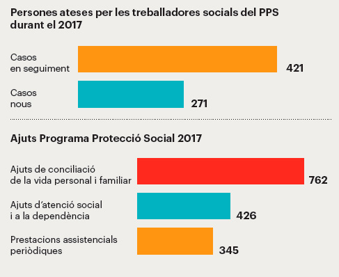 També hi ha hagut un augment considerable respecte a l'any anterior en les persones ateses al Programa de Protecció Social, concretament un 4,5 %, que representen unes 1.799 persones ateses (casos en seguiment, casos nous, ajuts de conciliació de la vida personal i familiar i prestacions assistencials periòdiques).