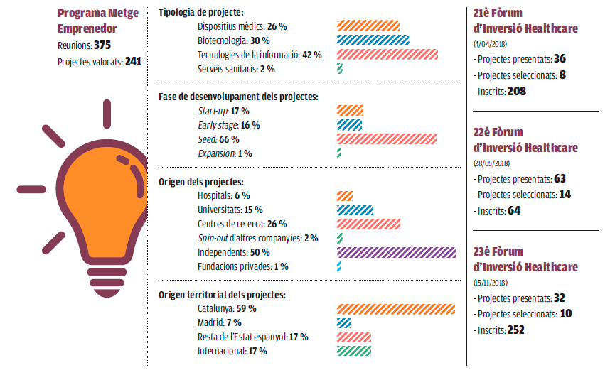 A més, durant el 2018 s'han organitzat les edicions 21, 22 i 23 del Fòrum d'Inversió Healthcare Barcelona, punt de trobada imprescindible per a emprenedors i inversors del sector salut. L'edició 22 ha estat la més internacional, ja que es va celebrar conjuntament amb el fòrum d'inversió EC2VC Investors Forum i en el marc del congrés HIMSS Europe & Health 2.0, esdeveniments en l'àmbit de la salut digital amb gran projecció i ressò mediàtic. En l'organització d'aquest Fòrum hi van participar el Col·legi de Metges de Barcelona, Barcelona Activa-Ajuntament de Barcelona, ESADE-BAN, Biocat i les institucions internacionals (HIMSS Europe, Health 2.0 i l'acceleradora eHealth Hub).