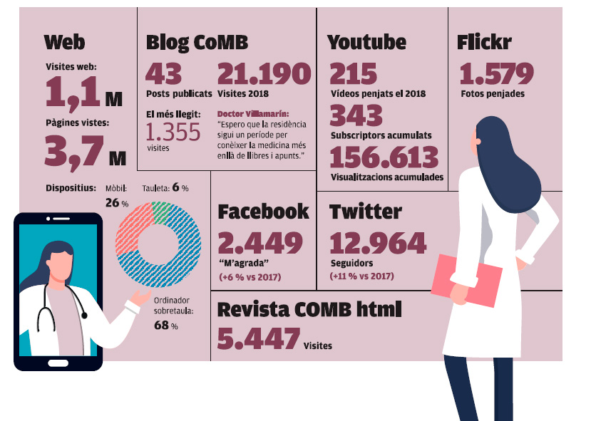 La comunicació és una eina fonamental per reforçar els valors de la professió i la seva relació amb els col·legiats i la ciutadania. La pàgina web del CoMB continua sent el canal que té més visibilitat i ha acumulat 1,1 milions de visites al llarg de 2018. Un dels espais que s'ha renovat ha estat el de la Secció de Metges MIR i Metges Joves, amb informació actualitzada al voltant de les especialitats MIR i de la residència. També s'ha incorporat a la pàgina web l'apartat Demografia mèdica, amb l'objectiu de donar a conèixer dades demogràfiques actualitzades del col·lectiu mèdic i analitzar, entendre i preveure els reptes i les necessitats tant dels professionals com del sistema sanitari.