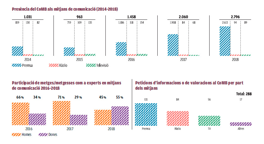 Destaquem que el 55% dels professionals referits des del CoMB als mitjans de comunicació com a portaveus experts han estat metgesses. Aquest percentatge reflecteix de manera molt ajustada la realitat demogràfica del col·lectiu mèdic, on el 55% són dones. Donar més visibilitat a les metgesses era un dels objectius del departament de Premsa i Mitjans Externs. Cal destacar també l'esforç reeixit per fer més visible als mitjans de comunicació l'activitat de les Juntes Comarcals del Col·legi, ja que les notícies sobre aquests actes s'han duplicat des de l'any 2016 ençà, sobretot a la premsa local.