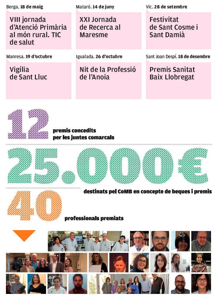 Des de les diferents juntes comarcals cada any es convoquen premis acadèmics per promocionar la recerca, la innovació i l'excel·lència. Durant el 2018 es van convocar 12 premis i, entre tots els treballs guardonats, el CoMB va destinar 25.000 € en concepte de beques i premis. Es van lliurar premis en les Jornades de la Professió celebrades al Bages, Baix Llobregat, Maresme, Osona i Vallès Occidental.