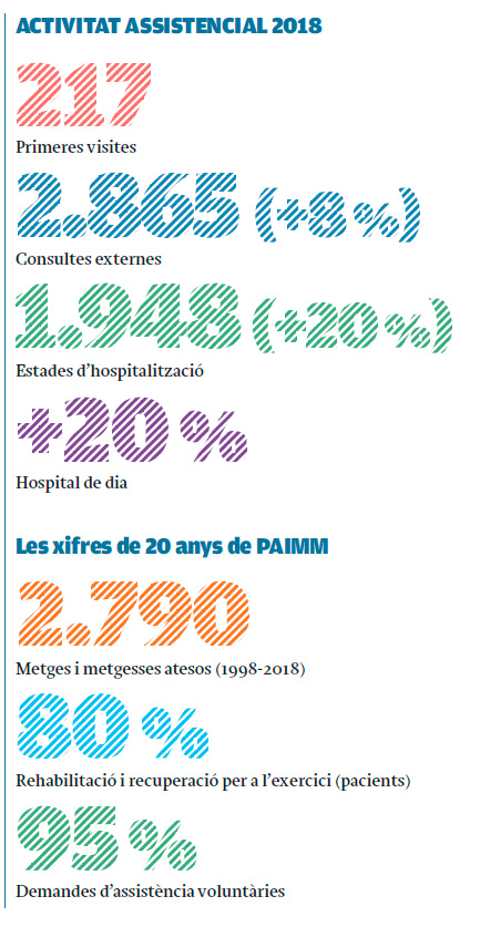 Pel que fa a l'activitat assistencial, durant l'any 2018 s'ha mantingut el nombre de primeres visites (217) i ha continuat el creixement de la demanda respecte de l'any passat, tant pel que fa a seguiments, de l'equip de psiquiatres, psicòlegs i treball social (2.865, un 8 % més), com d'estades d'hospitalització (1.948, increment del 20 %) i de l'activitat de l'hospital de dia (increment de les estades de gairebé 20 %) .