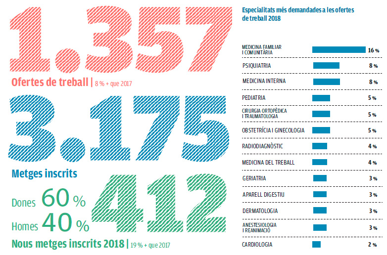 A finals de 2018 estaven inscrits al Servei d'Ocupació 3.175 metges. S'han inscrit durant l'any 412 professionals (19 % més que el 2017).