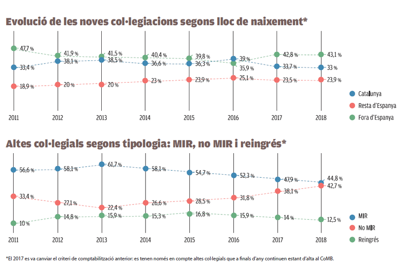 El nombre de metges nascuts a l'estranger continua augmentant i actualment representa el 20 % de la col·legiació. El creixement que ha experimentat aquest col·lectiu (de mitjana, un 4,9 % anual, els últims cinc anys) és clarament superior als metges nascuts a Catalunya (1,2 % de mitjana) i als de la resta de l'Estat espanyol (2,5 %). L'impacte d'aquest augment s'ha vist en les altes no MIR, que han passat de representar una quarta part del total d'altes fa cinc anys a ser-ne el 43 % enguany. Cal recordar que els estrangers suposen tres de cada quatre noves col·legiacions no MIR.